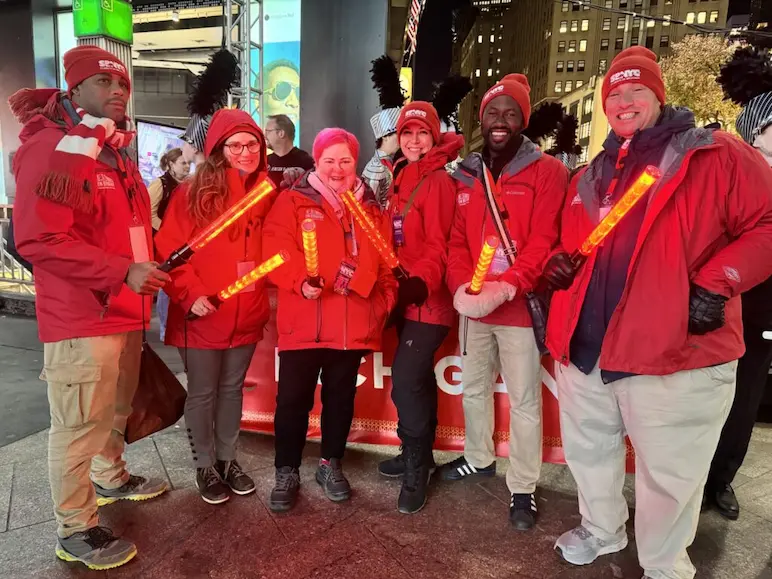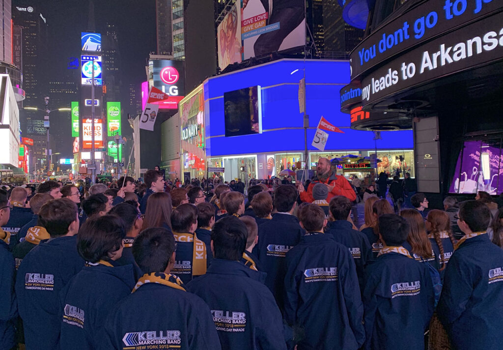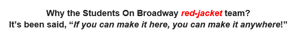 After experiencing T.E.A.M., the Students On Broadway difference, some directors and boosters have opined that we set the standard for on the ground student group management, especially on our home turf in NYC. Whether it’s our team’s red jackets, shirts, flags, or light sticks, feel assured that we will stand out in a crowd, in the middle of Times Square, below ground in an NYC Subway station, on the train during rush-hour, in a Disney World bus parking lot after the park closes on New Years’ Eve, or in any of our other cities and get your traveling ensemble from place to place in a safe & organized fashion.